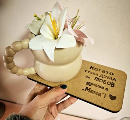Комплектът включва - подложка, чаша за кафе и ароматни сапунени цветя