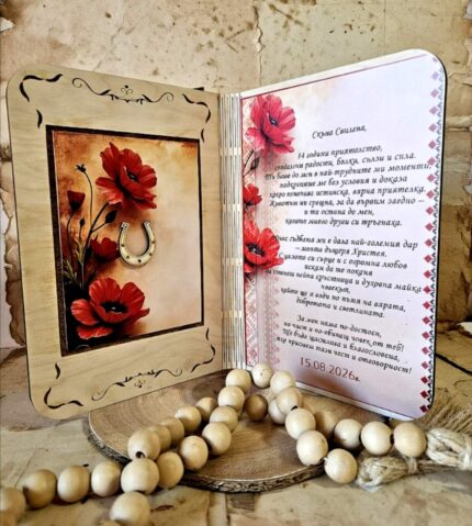 Персонализирана, дървена подложка за чаша за кафе в комплект с чаша. Подложката се предлага и самостоятелно.