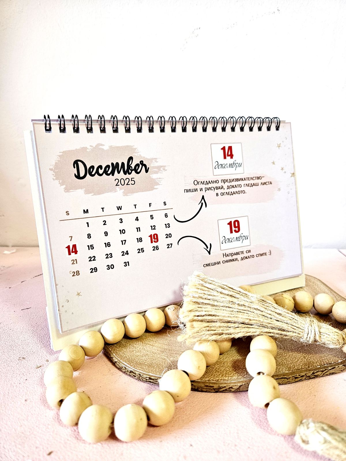 Забавен коледен календар за месец Декември с 13 забавни предизвикателства за вас и вашата половинка. Размер на календара 15/21см. Може да бъде персонализиран с Ваша снимка или тема по избор.