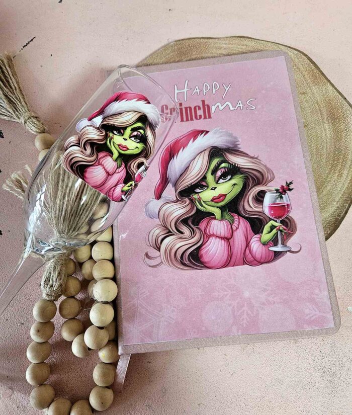 Коледен комплект „Мама Гринч“ с чаша за вино и тефтер. Могат да бъдат декорирани в кутия, която не е включена в цената.