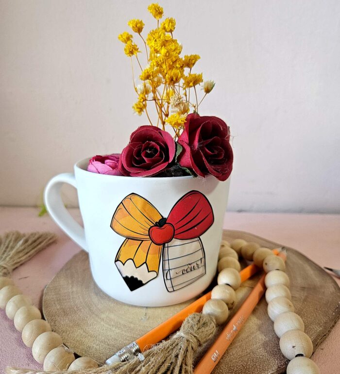 Персонализирана, декорирана чаша с цветя – сух гипсофил и изкуствени чаени рози